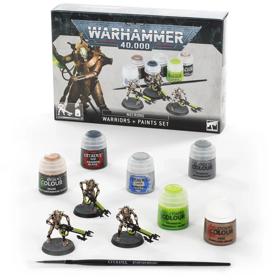 This box is the perfect way to start your collection of Necrons. You'll get three plastic Necron Warriors with distinct poses, the paints you need to prepare them for battle and a brush to get you started. These models are push fit, only requiring clippers to assemble - no glue, no mess.